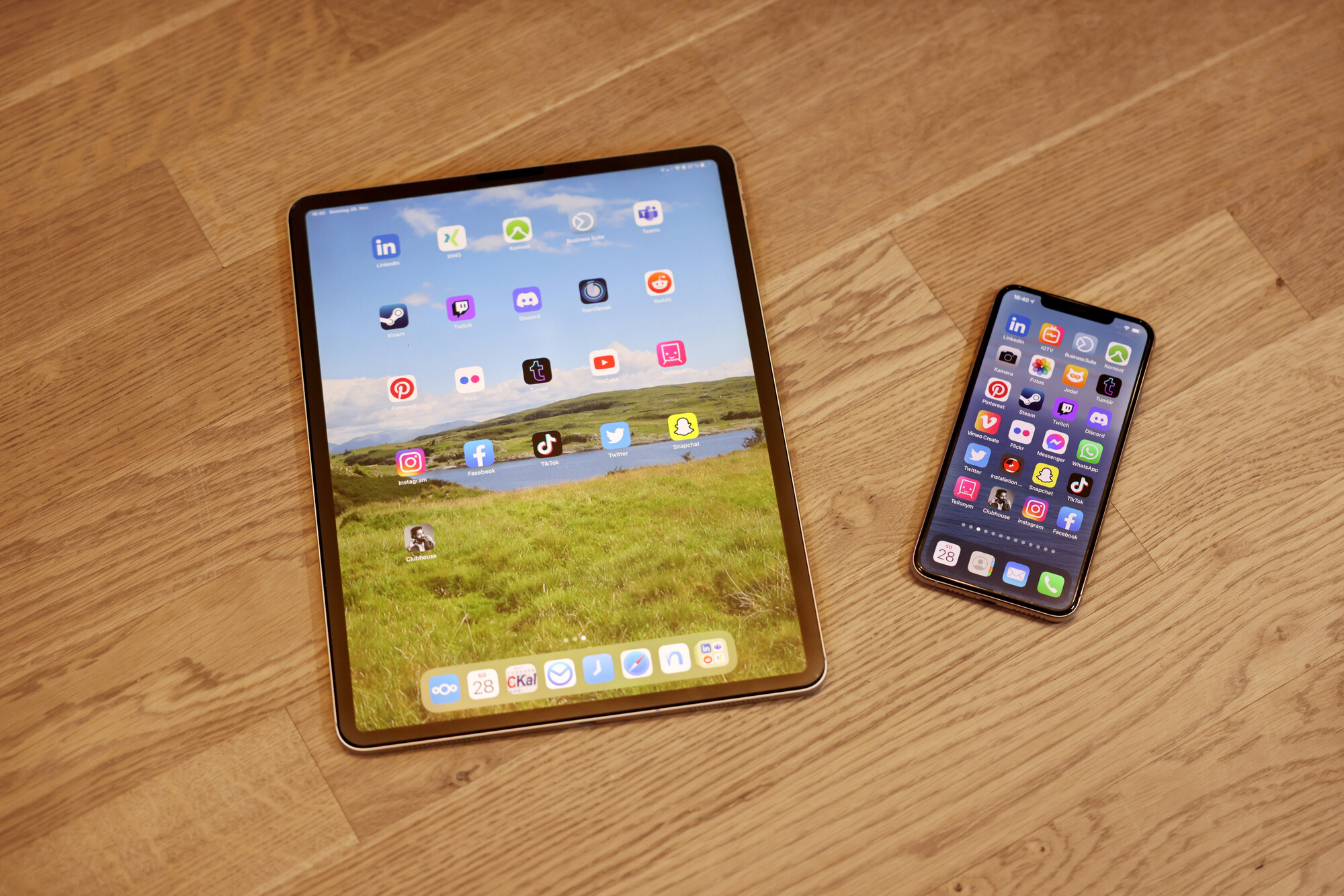 Auf einem Tisch liegen ein Tablet und ein Smartphone mit aktiviertem Startbildschirm.