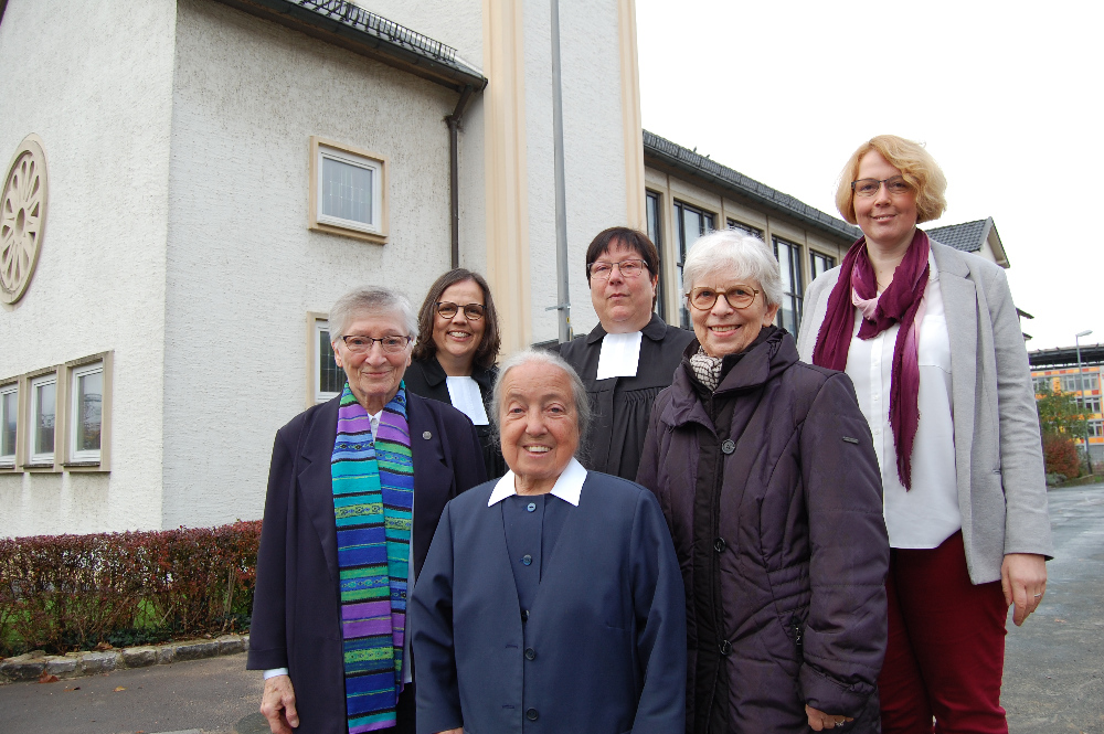Vor der Diakonissenhauskirche: Pastorin Elfriede Brehme (hinten, Mitte) wurde im Gottesdienst von Superintendentin Juliane Arndt (Zweite von links) und den Mitgliedern der Gemeindevertretung verabschiedet (von links): Schwester Christel Rücker, Diakonisse Brigitte Lange, Schwester Inge Landermann und Vorsitzende Dagmar Nitschke. Es fehlt Vorstand Axel Schulz.